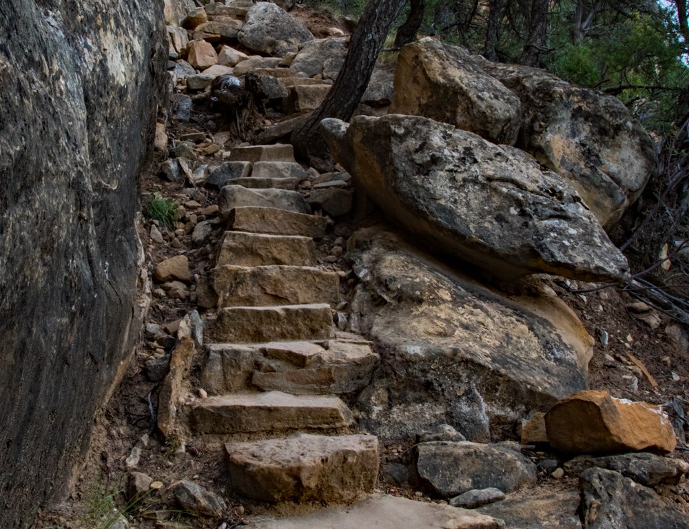 Here is a shot from a hike with a friend last Thursday in Mesa Verde National Park near Cortez, Colorado. My friend, Dave, and I had been hiking to some ancient petroglyphs on a trail that started near the Spruce Tree House cliff dwelling ruins. This staircase was one of the last strenuous parts of the hike as it took us up near the top of the mesa again.