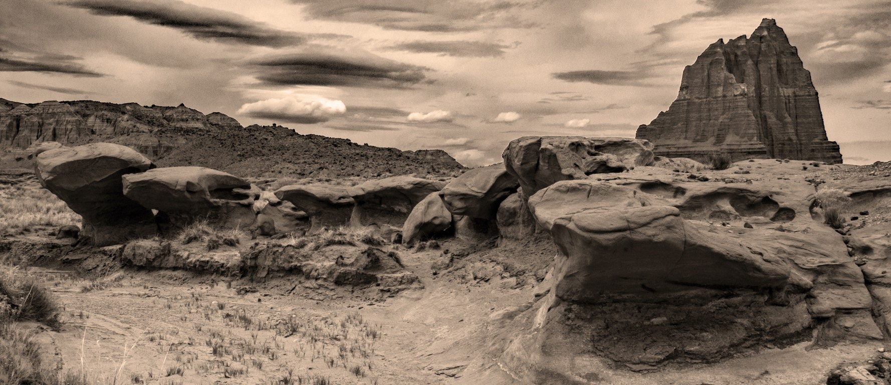 For me, I love the monochrome here because it really brings out that sky detail. And the Temple of the Sun seems even more prominent in the black and white against those lighter clouds. And I think that the lack of color allows one to really focus on the shapes and tones, rather than the colors. What drew me to this scene originally was the flowing, rounded shapes of the wash rocks blending with the curvy clouds against that monolithic Temple of the Sun. And I just feel that the monochrome brings out those features better than the color version.