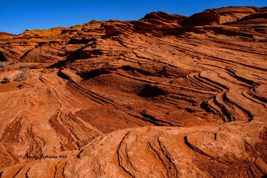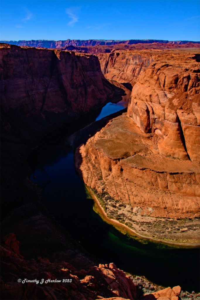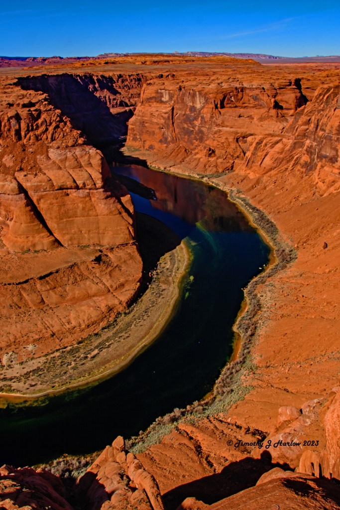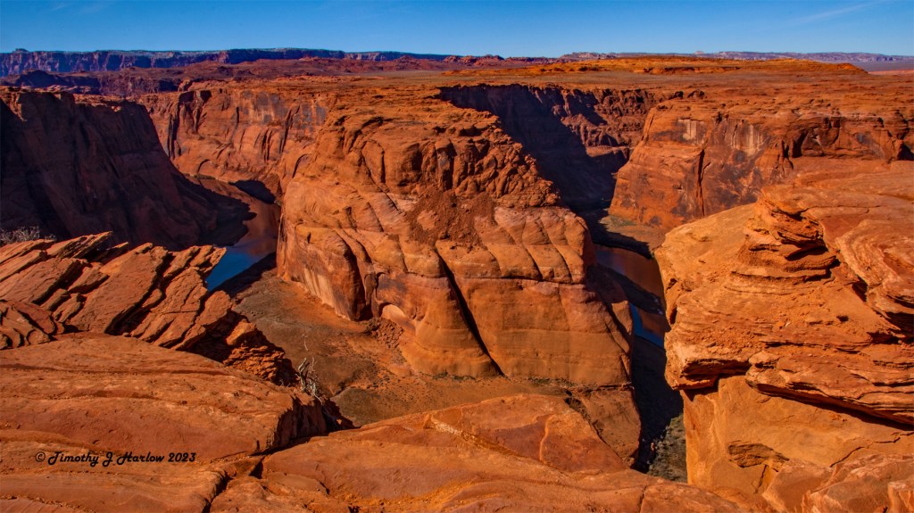 Anyway, what a view! The overlook presented an excellent view of the Colorado River far below the rim right at the apex of a huge, tight gooseneck carved out into the several hundred-foot-deep canyon below us. The place was pretty jammed, so I took a couple of photos of the goose neck and then decided to head off of the path for some quiet and perhaps a few more photos.