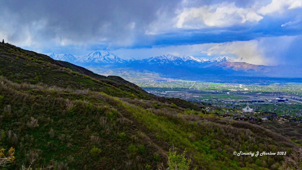 Anyway, after much up and down I found I was back on the original trail – the Alpine-Draper trail. I took a quick stop and looked over the Salt Lake Valley at a storm that was heading east toward me.