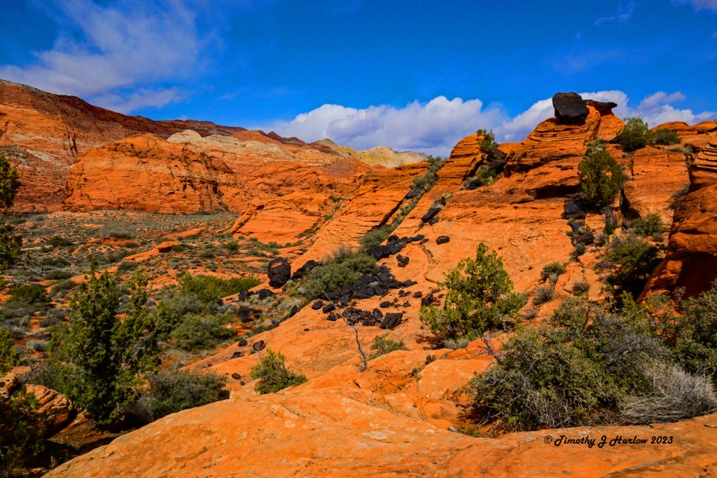 The Red Sands trail ends up going farther towards the northwest, generally over towards the Nevada border (but not that far). The trail takes off from a high point with a fairly steep descent down into yet another incredible canyon. (I kept waiting for the sand, but the beginning of the trail is quite rocky as it descends down into the canyon. 😀) Looking towards the north (I think based upon the angle of the sun) the scenery was changing more yet again. Near the top of the bluffs was a large amount of black lava rock. This made for some pretty cool photographs. I also found this interesting as I had no idea that this area had so much volcanic activity. But then again, this part of the world is not all that far from the Grand Canyon and the numerous volcanoes down in northern Arizona.
