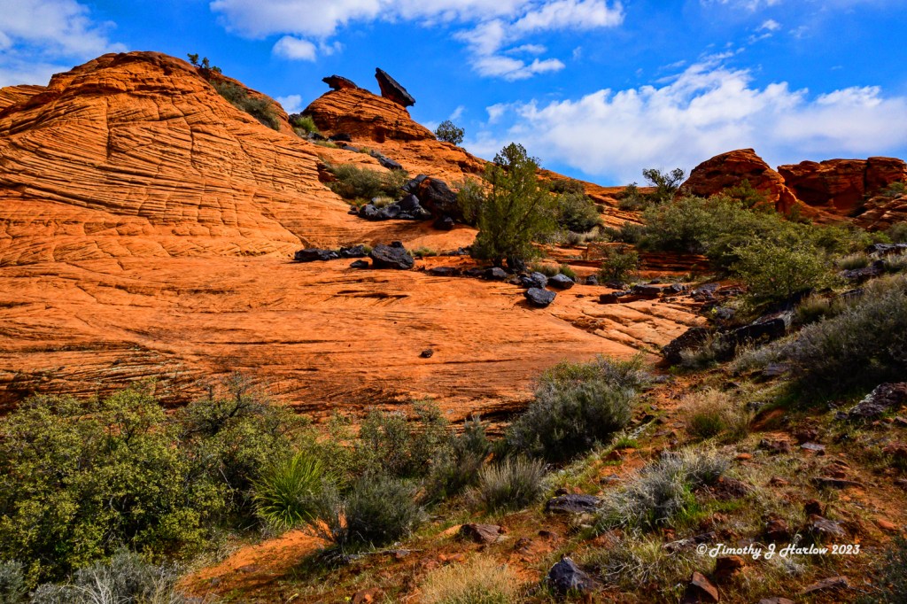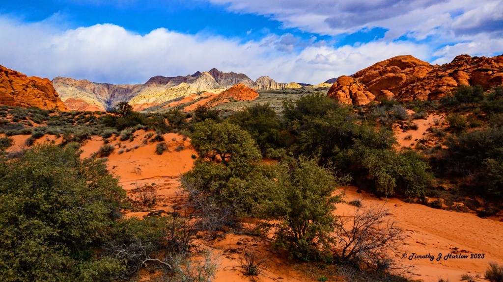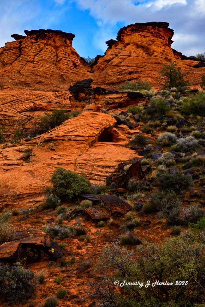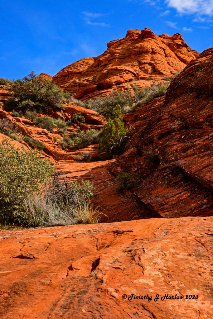 I wasn’t really paying much attention to the distance as I was busy taking in the scenery and shooting a lot of photographs. This was one of the first opportunities to take a really long hike with my newer Nikon Z50 system. The Z50 is a mirrorless 3/4 format camera, so the image sensor is the same size as the one in my older D500 that I had just sold. However, I would say that the image sensor quality and overall quality of the processor is quite superior to the D500. If you saw my earlier post, Stormy Days around Kanab, you may be able to tell the difference in quality over some of my older posts that I did with the D500. (Note: all of the photos I post on WordPress are reduced image sizes to 1000 pixels at the small dimension.)