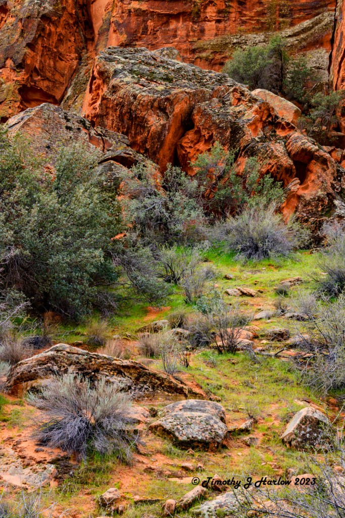 However, the scenery as you enter deeper into the canyon is absolutely breathtaking. With the heavy spring rains and wet winter, the desert was still fairly green. Compared to how wet and muddy everything was around Kanab, I just couldn’t believe how nice the trail was even after all of the rains. But, the St. George area is close to 3000 feet (914 m) lower than a lot of the area around Kanab.