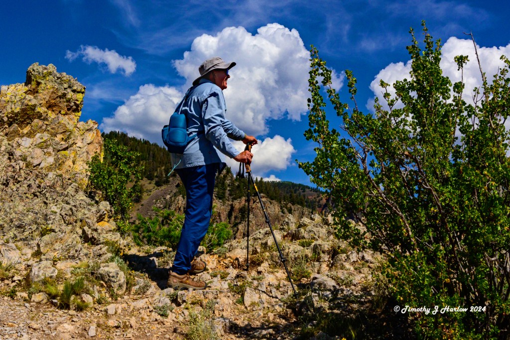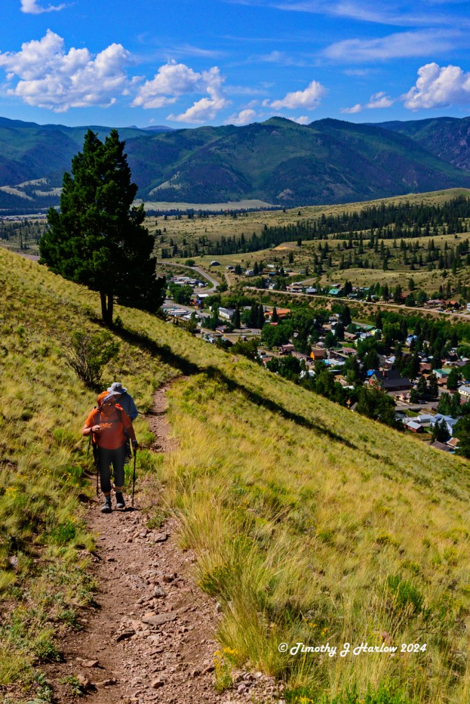 We left early as the trail has full sun exposure until the top. Even though Creede is at a pretty good altitude – 8,813 ft (2,686 m) – that summer sun still can get a bit warm. The trail out of Creede (it takes off right from downtown Creede) was quite steep, but technically fairly easy. It just takes a bit to get into the right rhythm for the steps to breaths. The views were quite beautiful, looking back across the valley and down into the town.