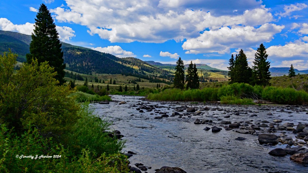 Let’s just say that I didn’t adhere to the recommended speed limits on the curves between Silverton and Creede. But I did encounter one more stoppage. Only a few miles from Wolf Creek Pass the road crosses a small bridge, and there was traffic stopped with police cars this side of the bridge. I gather a tractor-trailer rig must have lost its trailer brakes coming down the pass as the trailer was on fire!