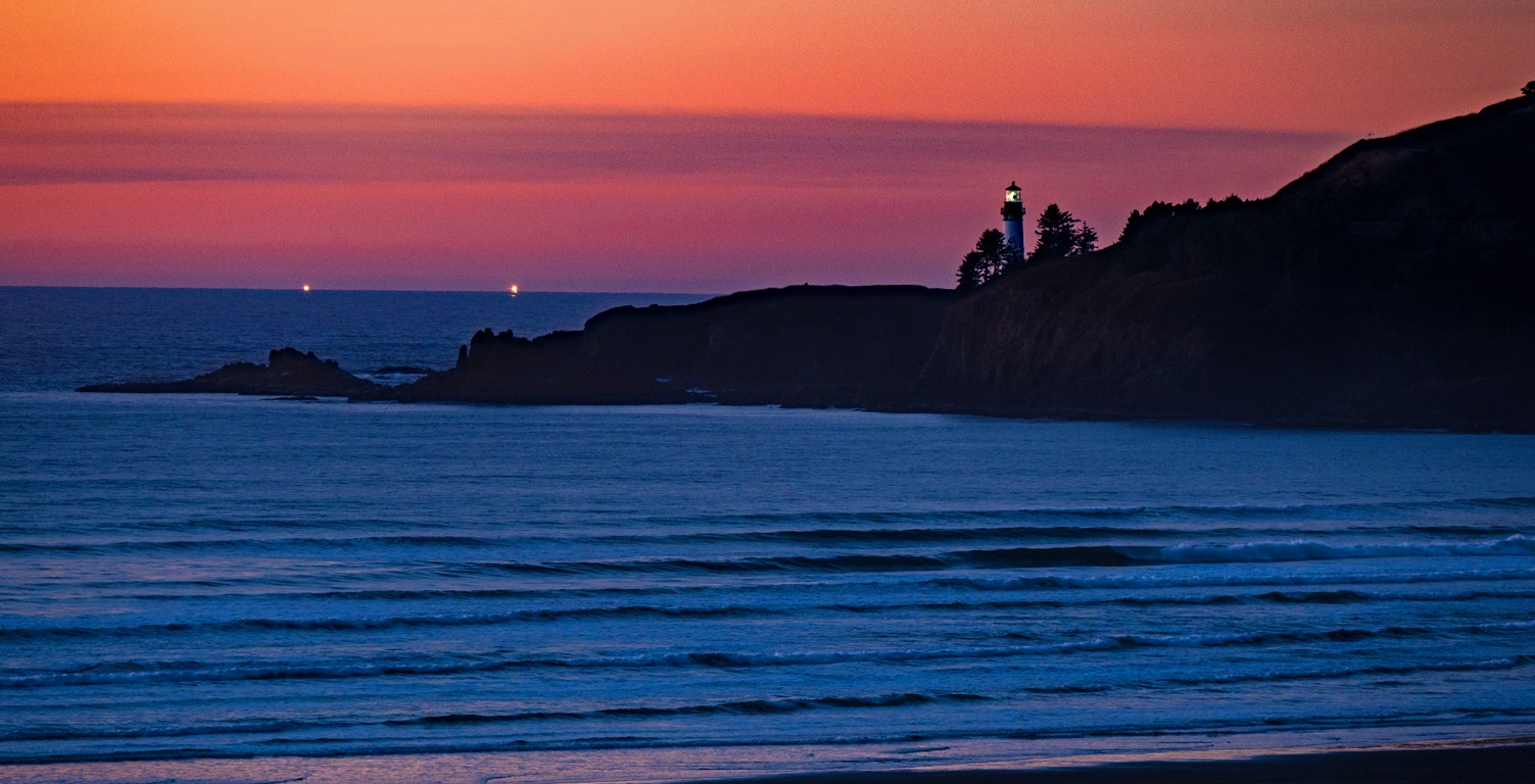 So, the last evening I was in Newport, the sky was really getting perfect as some clouds were finally moving back into the area. I mounted my camera with the 24-200mm zoom, and was able to catch a beautiful post-sunset shot of the Yaquina Head Lighthouse from my balcony.